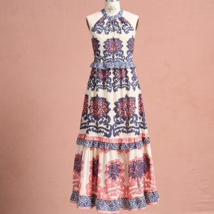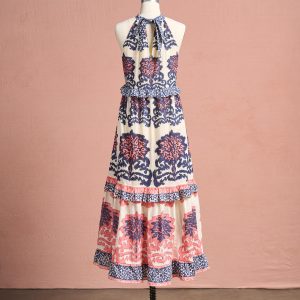 Enjoy the everyday in relaxed style with this halter neck dress with tropical inspired abstract hand blocked prints. Keyhole back with tie closure. two tiers with ruffle details. Cotton. Hand wash. Imported. Sundance exclusive. Sizes XS (0-2). S (4-6). M (8-10). L (12-14). XL (16-18). XXL (20-22). Approx. 49.5l.